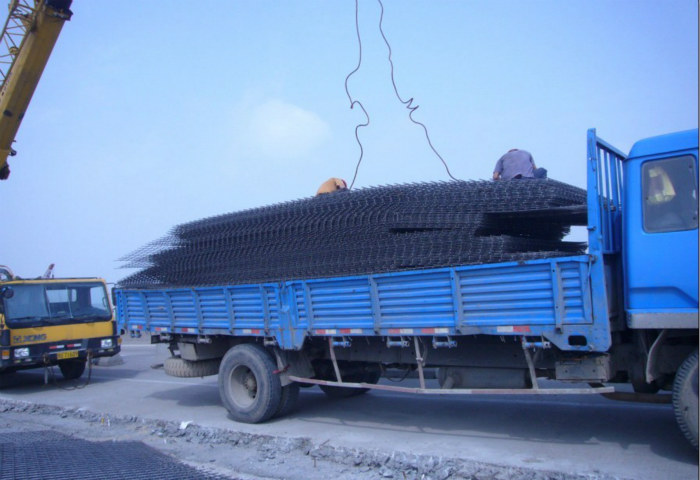 橋梁鋪設(shè)的10個(gè)鋼筋網(wǎng)片,抗裂性能強(qiáng),底網(wǎng)受力筋的錨固與搭接:伸入支座的錨固長度不小于10d(d為縱向受力鋼筋直徑),且不小于100mm。采用雙層雙向底網(wǎng)時(shí),先鋪設(shè)編號帶“b”網(wǎng)片,各冷軋帶肋鋼筋焊接網(wǎng)片之間不搭接(架立筋方向),同向鋼筋焊接網(wǎng)片間距不大于受力鋼筋的間距;采用單層底網(wǎng)時(shí),先從中間至兩邊鋪設(shè)編號帶“b”網(wǎng)片,#后鋪設(shè)編號帶“l(fā)”網(wǎng)片,各焊接網(wǎng)片之間需搭接,搭接采用疊搭法,搭接長度不小于規(guī)范規(guī)定搭接長度。
